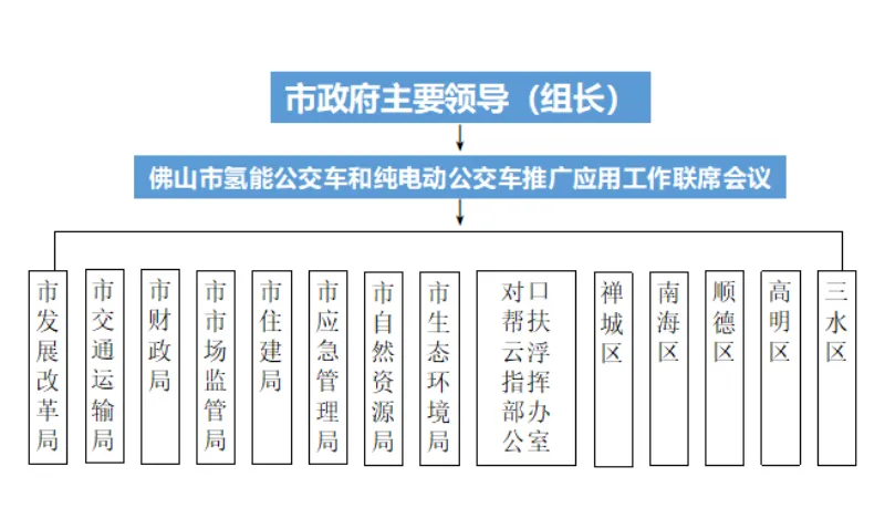 (一)市委、市政府高度重视,成立领导小组。为完成氢能公交推广应用任务,佛山市成立以市政府主要领导为组长、各区和各部门主要负责人为成员的佛山市氢能公交车和纯电动公交车推广应用工作联席会议制度,统筹指导全市氢能公交车应用推广工作。各区人民政府、市相关单位根据职责分工,细化分解任务,做到目标、时间、措施、人员、保障“五落实”。